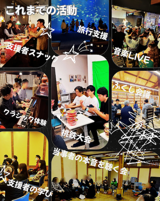 - 当事者・家族の願いを形にする(対当事者) 余暇の充実「旅行支援」、「障がいのある人もない人もともに楽しむ音楽LIVE」の開催。地域の財団の協力を得た「ふくし会議」では障がい当事者やその家族の本音、体験談を聴く会を実施。あきらめていた外出や対話を形にし、当事者の声を社会へ繋いでいます。