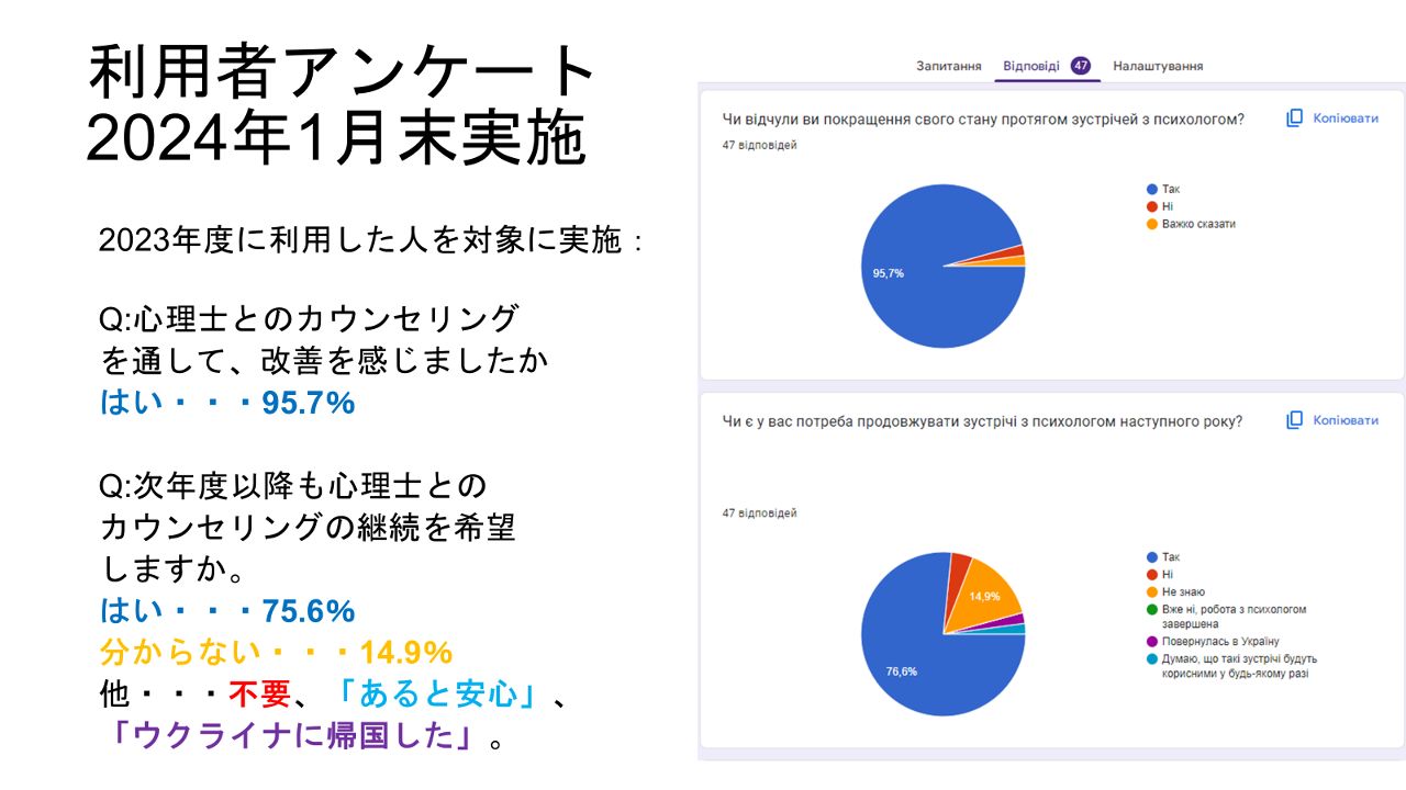 2024年1月に実施した利用者アンケートでは、8割弱が事業の継続を望み、9割強が身近なウクライナ人に事業を勧めたいと答えています。日本では言葉の問題ゆえに、他に同規模で安定した専門的な支援を提供しているところはありません。