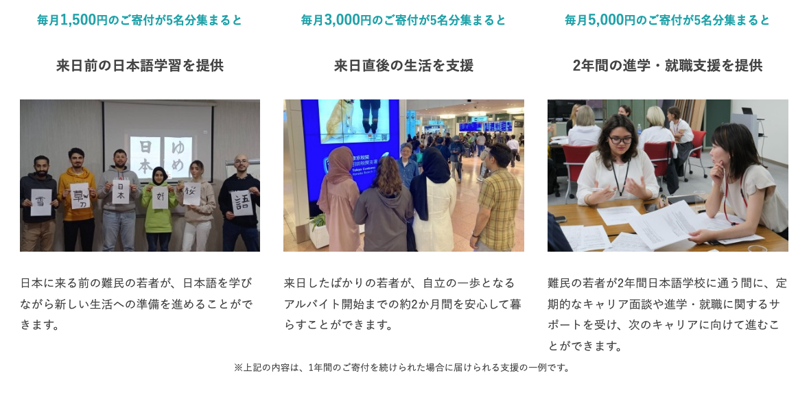 皆さまからのご寄付は、一般寄付としてお受けし、難民留学生の受け入れと、日本での自立に向けて大切に活用させていただきます。例えば、月々のご支援を1年間続けてくださった場合、以下のようなご支援が実現できます。