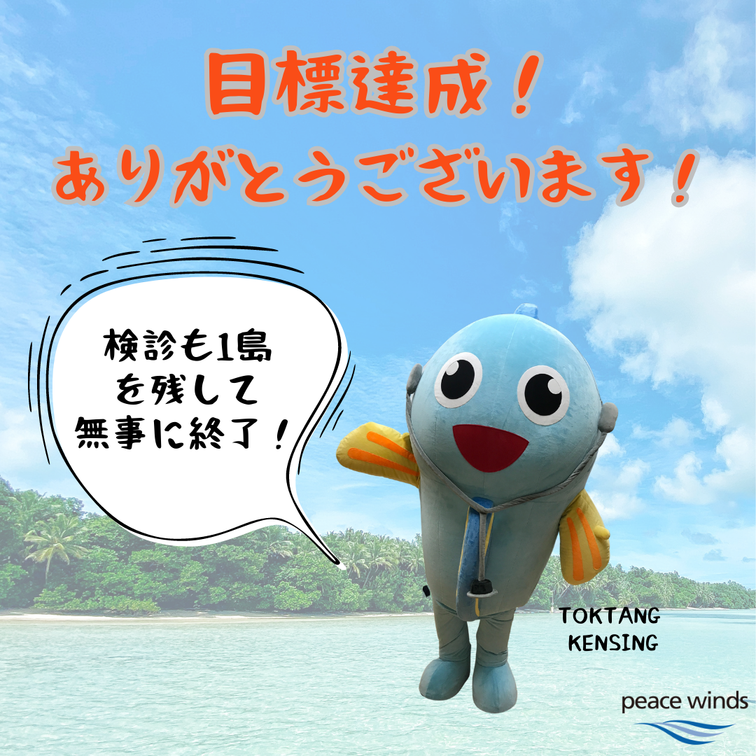 2023-08-21 20:47無事、全ての検診を終了し、minpoも終了しました!天候によって延期していました、アンガウル島での検診も今日無事に終了し、今回の巡回検診は全て終了となりました。 合計で100名を超す参加者の方々が検診を受けてくれています。現地の医師からは少しずつ健康に対する意識も変わってきている気がする...というコメントももらっています。 そして、皆さまのおかげで、無事minpoも目標歩数を達成しています! 達成どころか目標歩数よりもずっと多くの歩数に...! 本当に多くの方々からご支援を頂きありがとうございます。 次回検診実施にもまたminpo実施予定ですので、是非その際はご参加ください! 本当にありがとうございました!2023-08-21 20:47無事、全ての検診を終了し、minpoも終了しました!天候によって延期していました、アンガウル島での検診も今日無事に終了し、今回の巡回検診は全て終了となりました。 合計で100名を超す参加者の方々が検診を受けてくれています。現地の医師からは少しずつ健康に対する意識も変わってきている気がする...というコメントももらっています。 そして、皆さまのおかげで、無事minpoも目標歩数を達成しています! 達成どころか目標歩数よりもずっと多くの歩数に...! 本当に多くの方々からご支援を頂きありがとうございます。 次回検診実施にもまたminpo実施予定ですので、是非その際はご参加ください! 本当にありがとうございました!
