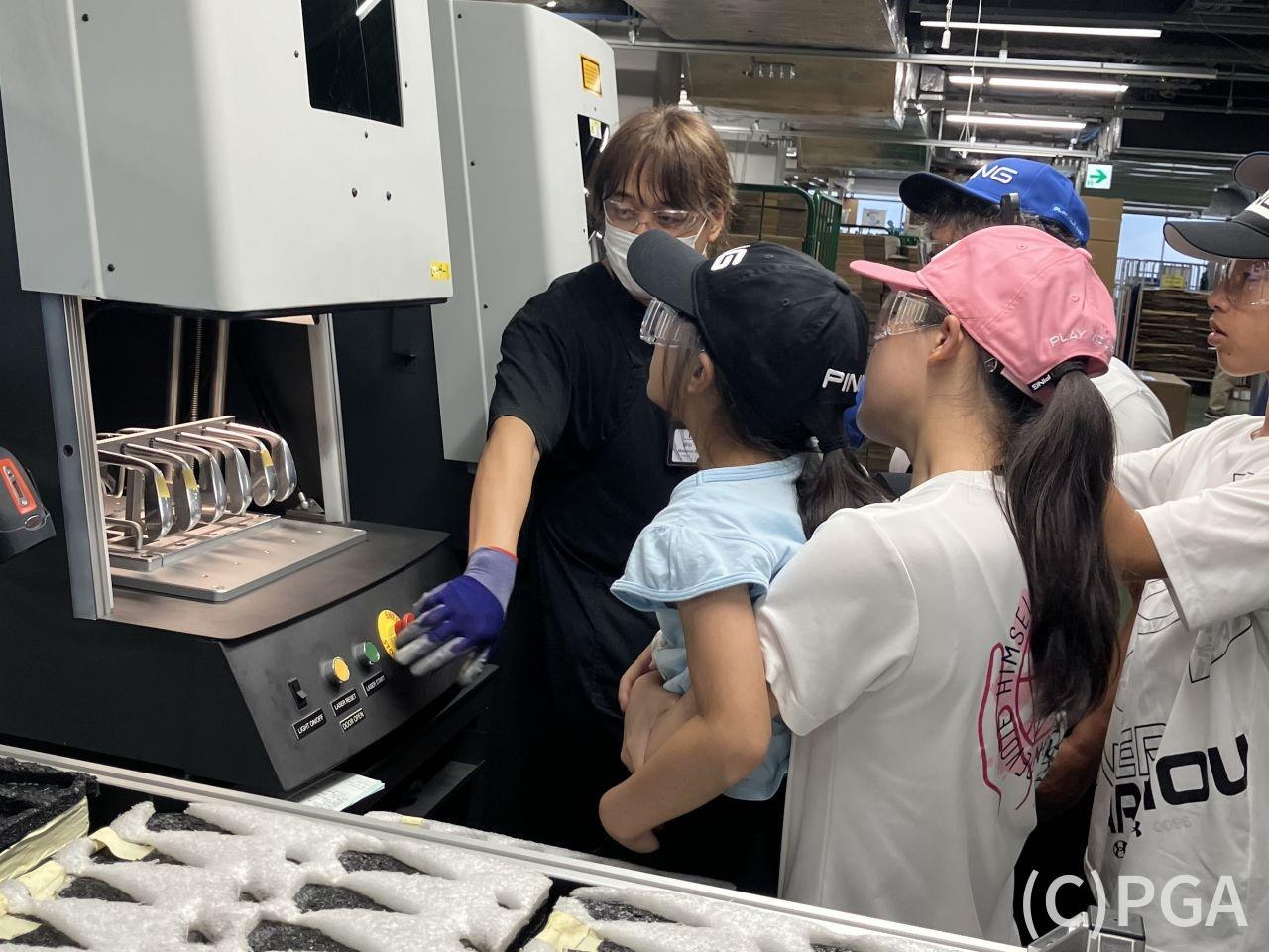 フィッティングに長けているPINGゴルフジャパンならではの技術やこだわりを知ってもらい、自分にあったクラブで試打。その後、組み立て工場へ移動し工場内を見学した。様々なパーツを指示書の内容の通りに何人もの職人の手によって丁寧に組み立て、ロフト角とライ角は手作業で調整、出荷されていく。