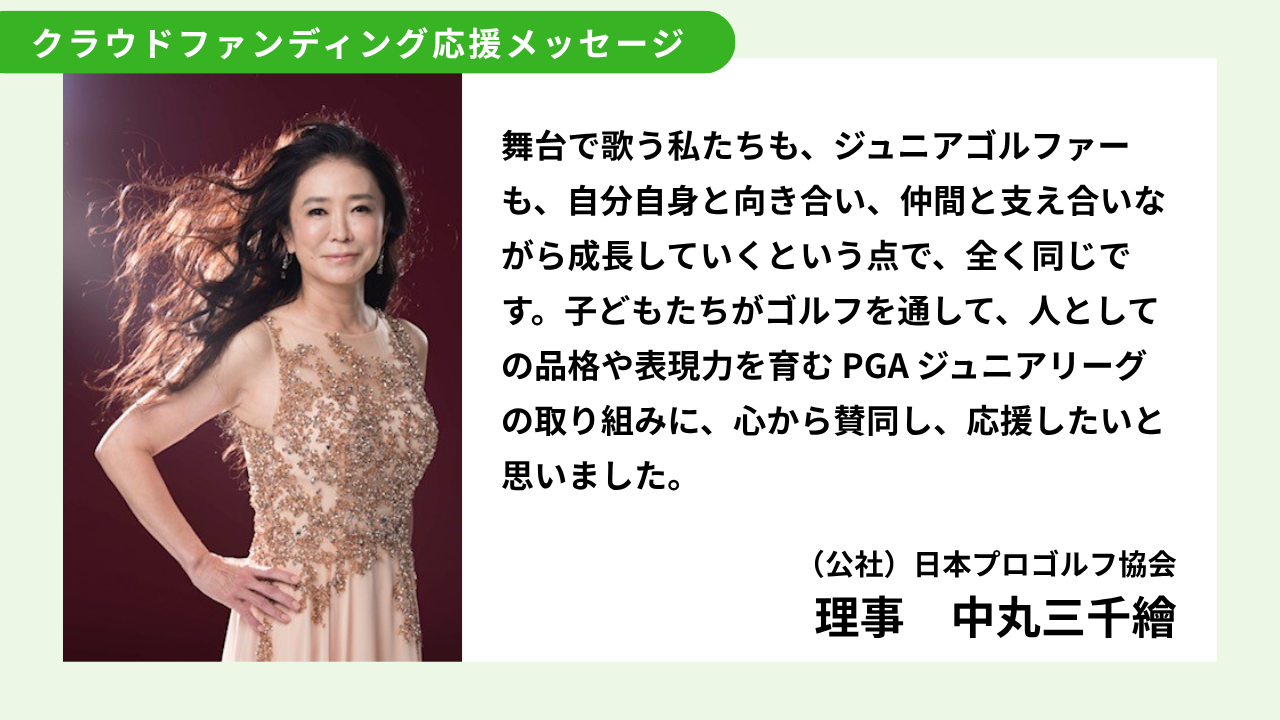 オペラ歌手であり、日本プロゴルフ協会理事を務める中丸三千繪氏から、PGAジュニアリーグのクラウドファンディングへの温かい応援メッセージをいただきました!