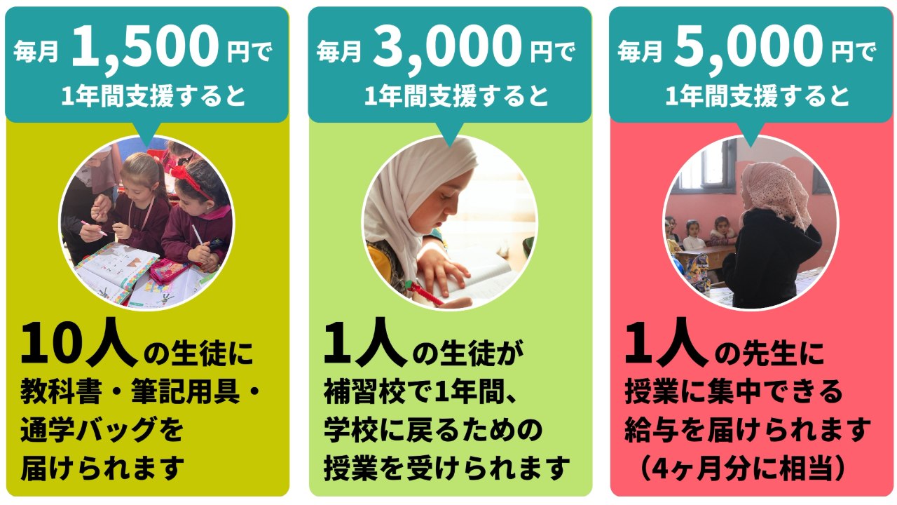 届けていただいたご支援は、帰国した子どもたちが、アラビア語など母国語の授業と心のケアを受けて、学校に復帰するための補習校支援を開始・維持していくために大切に使わせていただきます。
