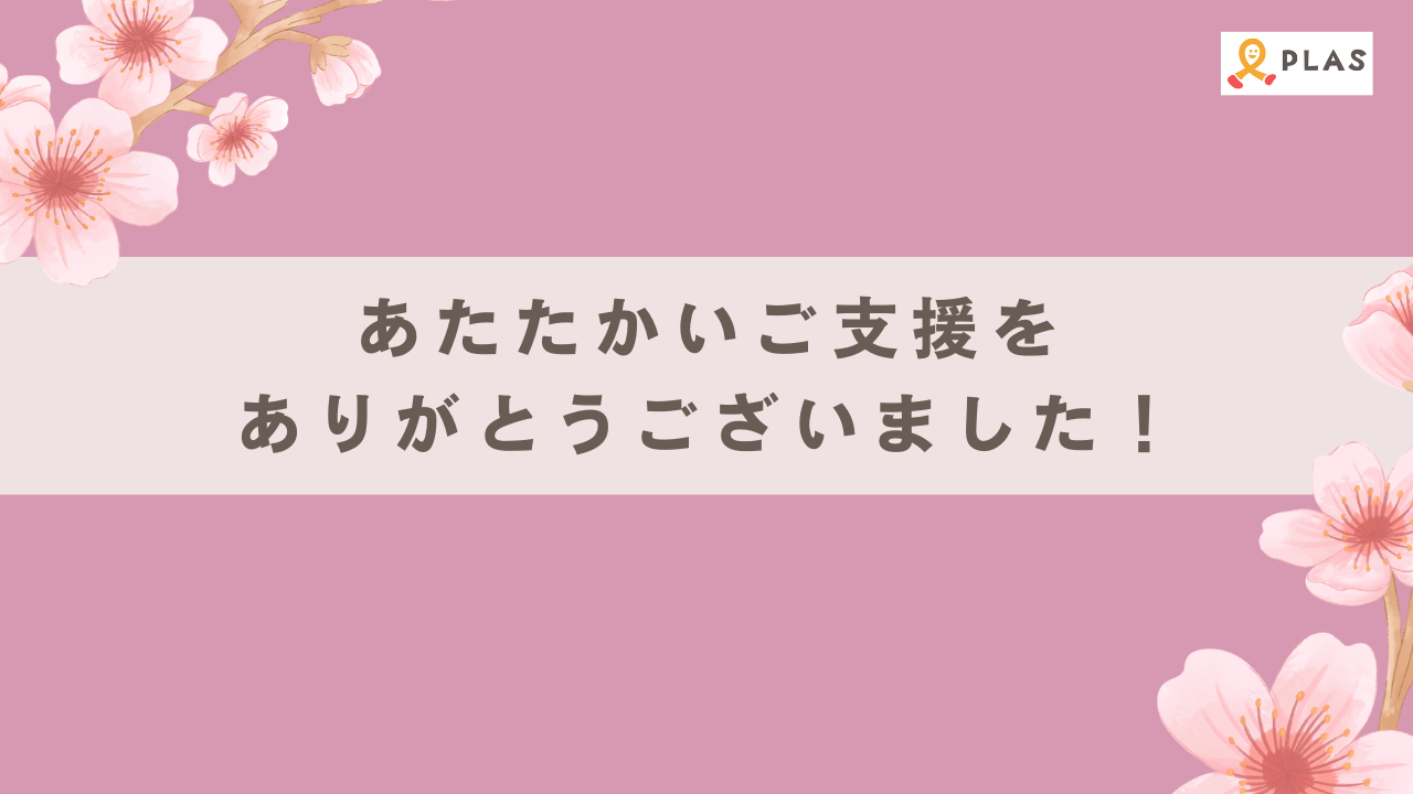 2025-03-10 18:01【3月限定】PLAS活動説明の動画を公開!本日まで、23名の方から233,600円のご支援をいただきました。誠にありがとうございます。2025-03-10 18:01【3月限定】PLAS活動説明の動画を公開!本日まで、23名の方から233,600円のご支援をいただきました。誠にありがとうございます。