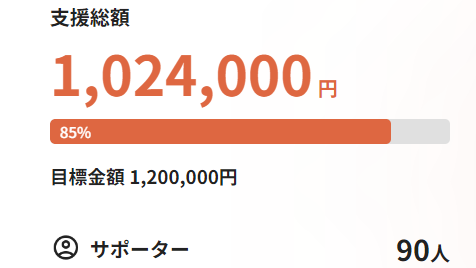 2024-09-25 21:26あと5日で30万円の挑戦現在74名の方にご支援いただき、目標金額の75%(907,000円)に到達することができました。これまでご支援いただいた皆様、そしてSNSでシェア応援に協力いただいた皆様、本当にありがとうございます。2024-09-25 21:26あと5日で30万円の挑戦現在74名の方にご支援いただき、目標金額の75%(907,000円)に到達することができました。これまでご支援いただいた皆様、そしてSNSでシェア応援に協力いただいた皆様、本当にありがとうございます。