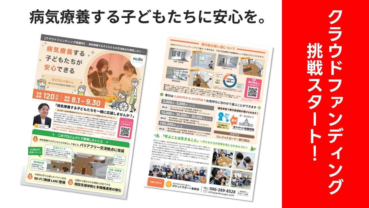2024-08-02 13:33【クラファンスタート】広報チラシの発送をスタートしました!クラウドファンディング開始初日からSNS等を通じてたくさんの応援メッセージやSNSコメントをいただき、本当にありがとうございます。 本日、プロジェクトの内容や私たちが実現したいことをまとめた広報チラシが完成しました! いつもポケットサポートをご支援いただいている応援団の皆様をはじめ、講演会やフォーラム・学会等での配布も予定しております。2024-08-02 13:33【クラファンスタート】広報チラシの発送をスタートしました!クラウドファンディング開始初日からSNS等を通じてたくさんの応援メッセージやSNSコメントをいただき、本当にありがとうございます。 本日、プロジェクトの内容や私たちが実現したいことをまとめた広報チラシが完成しました! いつもポケットサポートをご支援いただいている応援団の皆様をはじめ、講演会やフォーラム・学会等での配布も予定しております。