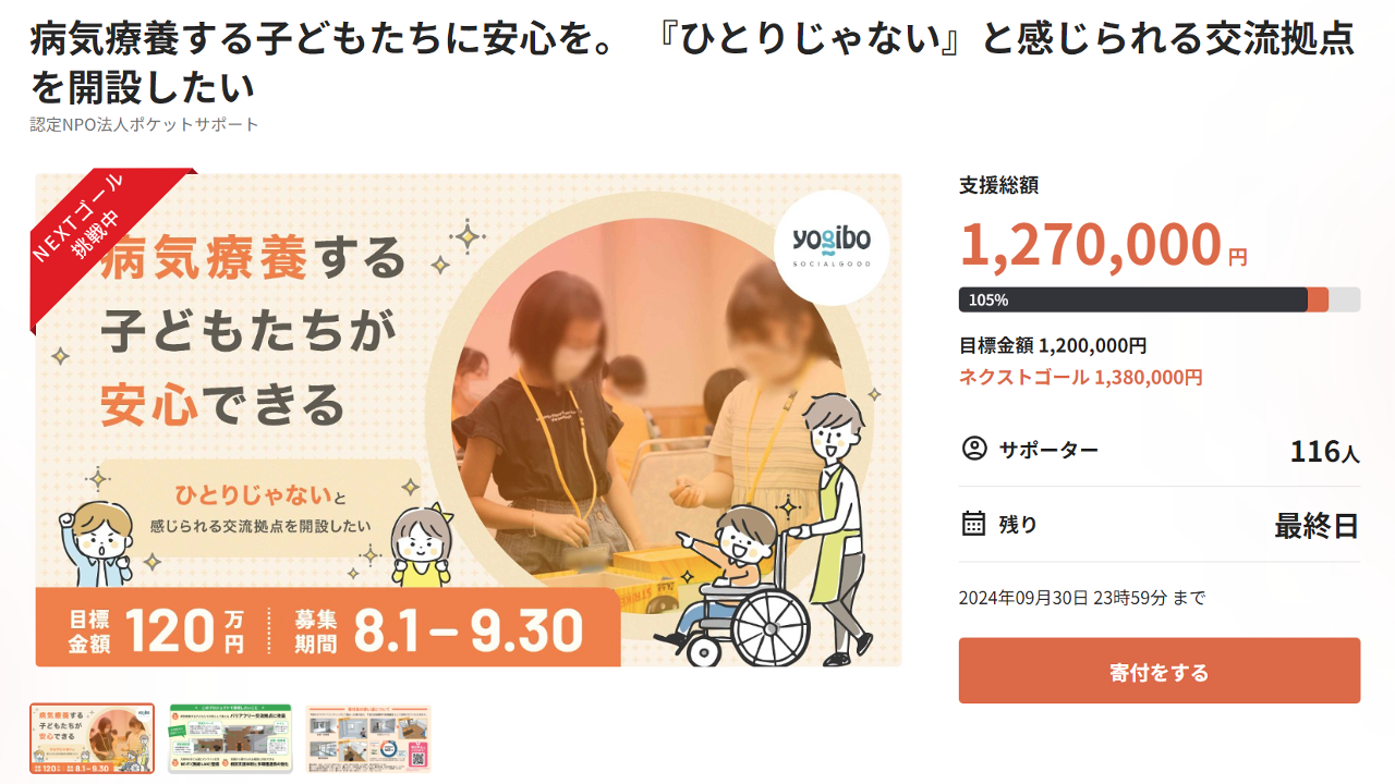 2024-09-30 10:35【120万円達成】ネクストゴール本日が最終日新しい交流拠点改装のため8月から開始したクラウドファンディングですが、目標金額120万円を本日、9月29日に達成することができました。ご寄付だけでなくAmazon現物寄付、SNS等でのシェアや応援メッセージなど、皆様の温かいご支援に感謝を申し上げます。ありがとうございます。 資金面で不安がありながらもスタートした新しい交流拠点を開設するプロジェクトですが、皆様と一緒に作り上げることができ、ポケットサポート職員一同、とても嬉しいです。2024-09-30 10:35【120万円達成】ネクストゴール本日が最終日新しい交流拠点改装のため8月から開始したクラウドファンディングですが、目標金額120万円を本日、9月29日に達成することができました。ご寄付だけでなくAmazon現物寄付、SNS等でのシェアや応援メッセージなど、皆様の温かいご支援に感謝を申し上げます。ありがとうございます。 資金面で不安がありながらもスタートした新しい交流拠点を開設するプロジェクトですが、皆様と一緒に作り上げることができ、ポケットサポート職員一同、とても嬉しいです。