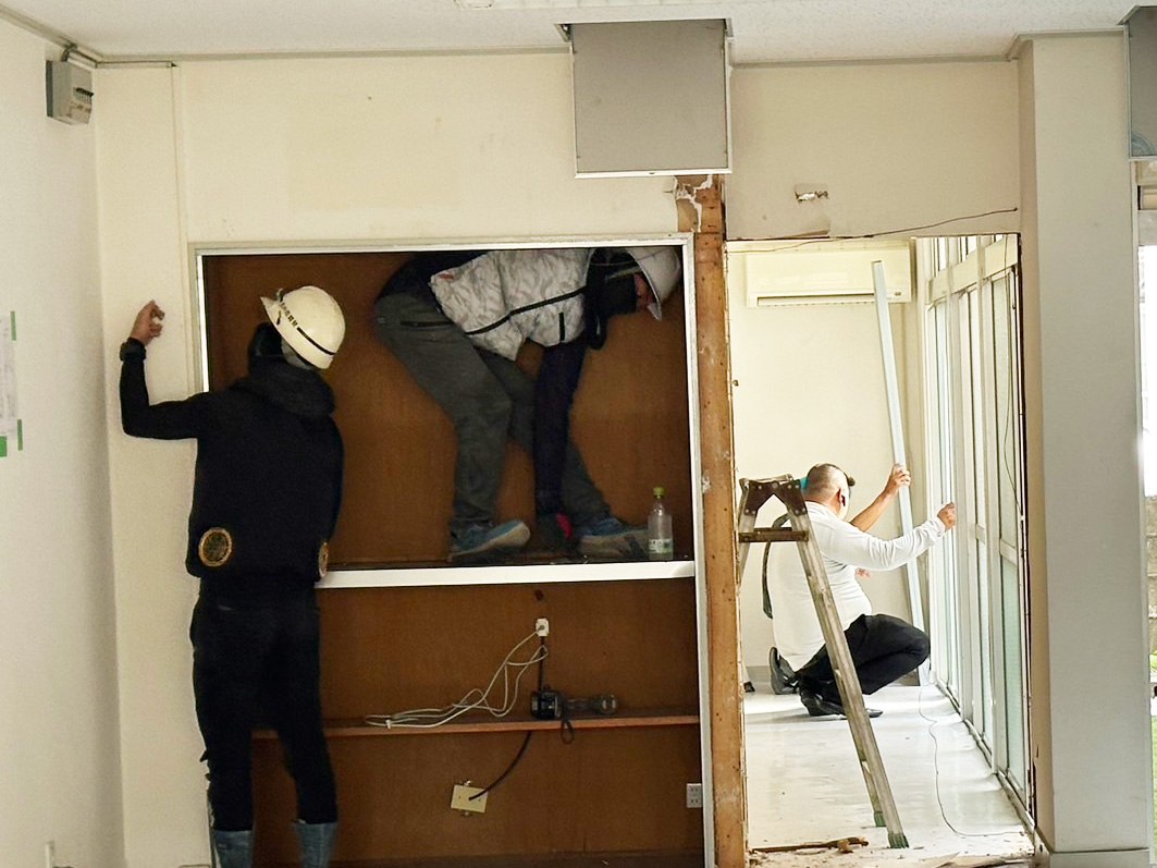 猛暑が続いていますが、新しい交流拠点ではエアコンも交換するため空調がない状態で、解体業者さんや電気屋さん、大工さん、水道屋さんなど各分野のプロフェッショナルの皆さんが汗をかきながら頑張ってくださっています。本当にありがとうございます。