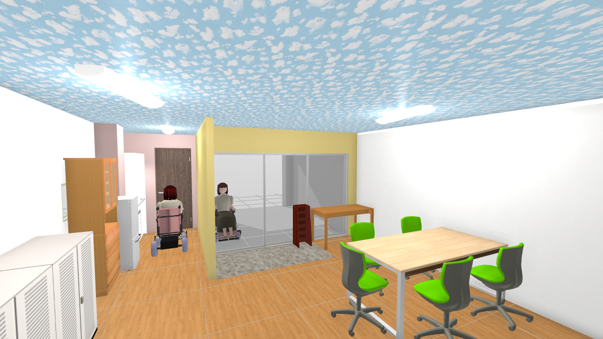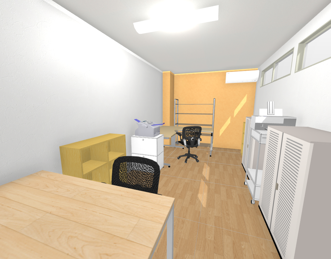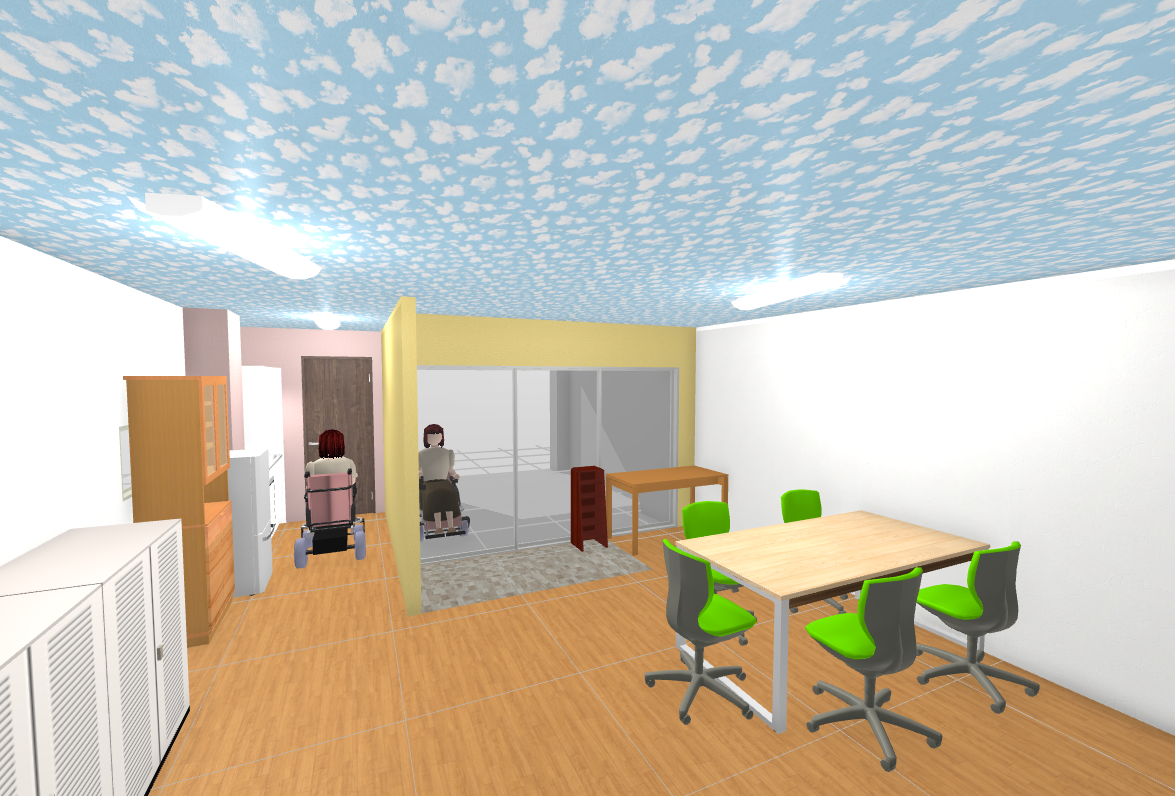 明るい色の床材と、左右の壁にはプロジェクター投影できるように白色系。