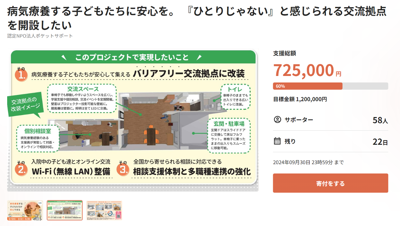 9月30日まで残り3週間となりましたが、病気療養する子どもたちが将来に希望を持って自分らしく暮らせるように、そして一人でも多くの子どもたちが安心して集える交流拠点になるよう皆様のご支援を引き続きよろしくお願いいたします。