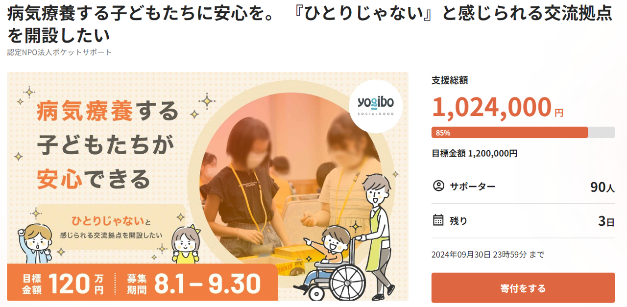 あと20万円で目標金額120万円を達成でき、病気療養する子どもたちが集う新しい交流拠点を、さらに充実した施設に改装できます。最後のひと押しにご協力お願いします。