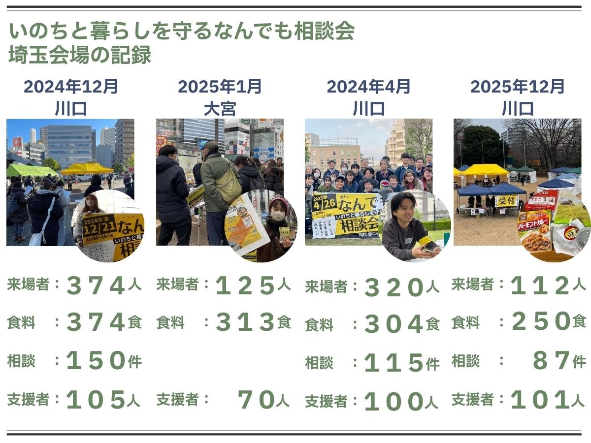 年3回行われる「なんでも相談会」の実行委員会に参加しています。埼玉の相談会場にて、毎回100〜300人を超える方に食料を渡し、相談を受け、支援をおこなっています。
