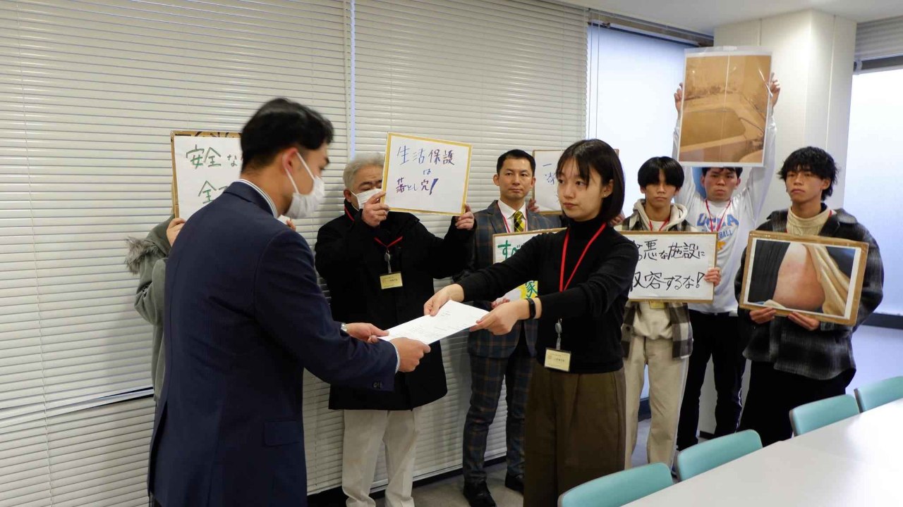 これは、今年11月にNPO法人POSSEに寄せられた、現在葛飾区の「無料低額宿泊所」に暮らす50代男性からの相談の一部抜粋です。こうした無低の実態を背景に、私たちNPO法人POSSEは12月27日に、施設に収容された当事者と共に、厚生労働省に対して、施設入居以外の選択肢の提示を求める通達を要求する申し入れを行いました。申し入れのあとは、行政の対応改善を求めるスピーチ、記者会見を行いました。