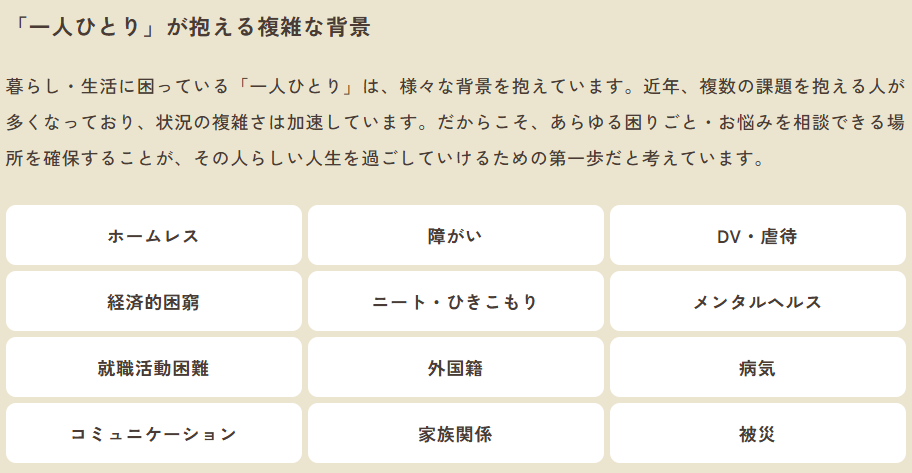また、そういった方々の中には、誰に相談していいか分からない、身近に頼れる人がいないなど、様々な環境要因により社会的に孤立化している場合があり、申請主義である公的支援の枠組みだけでは、救われない方々がたくさんいます。
