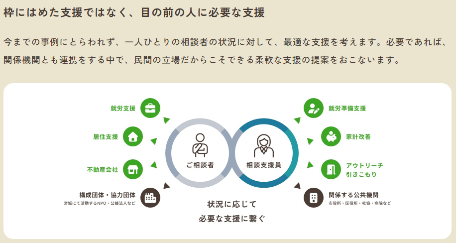 また、相談するだけでなく、居住支援、就労支援、アウトリーチ・引きこもり支援まで、その人に合わせた様々な支援を組合せ、行政や他機関とも連携しながら、その人らしい生活を歩めるようになるまで、伴走型の支援を提供しています。