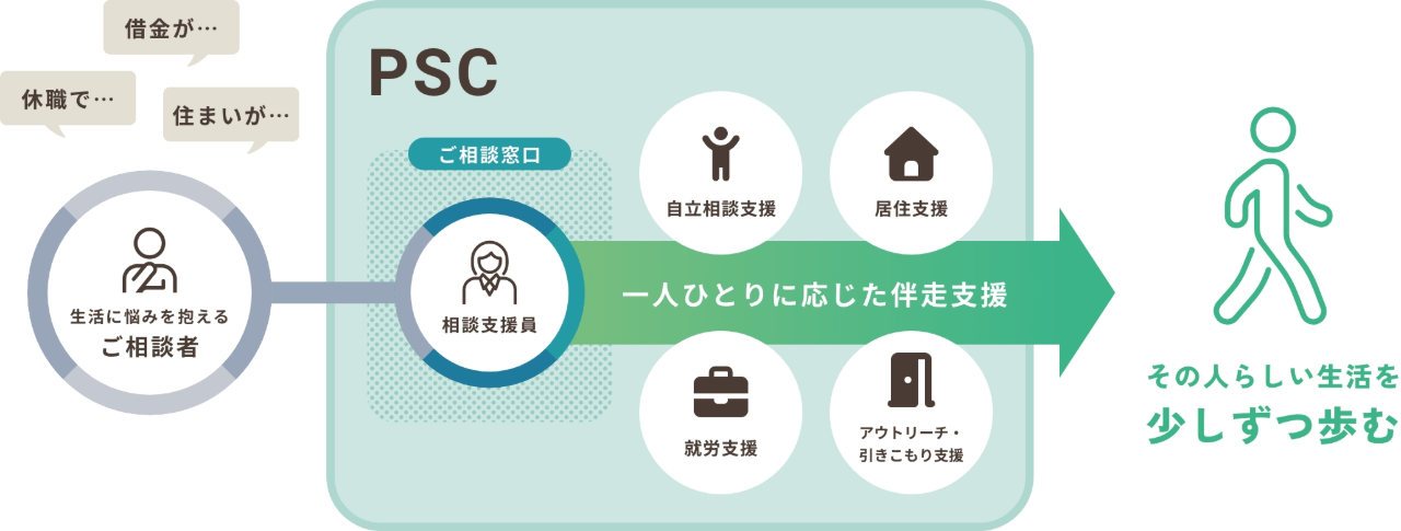 パーソナルサポートセンター(PSC)は、生活に悩みを抱える方々への支援を行うために2011年3月に設立されました。ホームレス・障がい者・DV被害者・ひとり親世帯・ひきこもり・就労困難者などの社会的困窮状態にある方々を対象に、その人の仕事・⽣活・住まいを寄り添い、伴⾛⽀援で⽀える活動をしています。そして、本⼈の意思のもとに暮らしを作り直し、⾃⽴した⽣活を歩むことが可能となるようなセーフティネットを地域に作ることを目指しています。