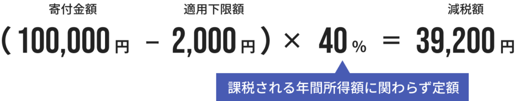 所得税率に関係なく、所得税額から直接寄付金額の一定割(40%)が控除されるため、小口のご寄付にも減税効果が大きくなります。(所得税額の25%が上限額)