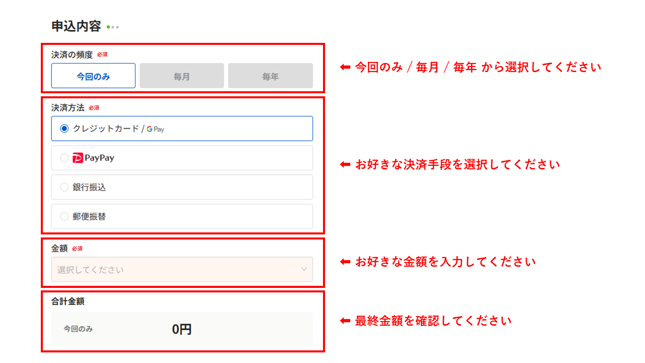 初回ご寄付時に「毎月」または「毎年」を選択いただくことで、次回以降はお手続き不要で継続的にご寄付いただくことができます。
