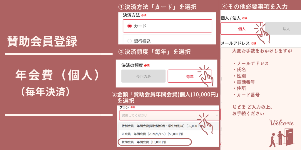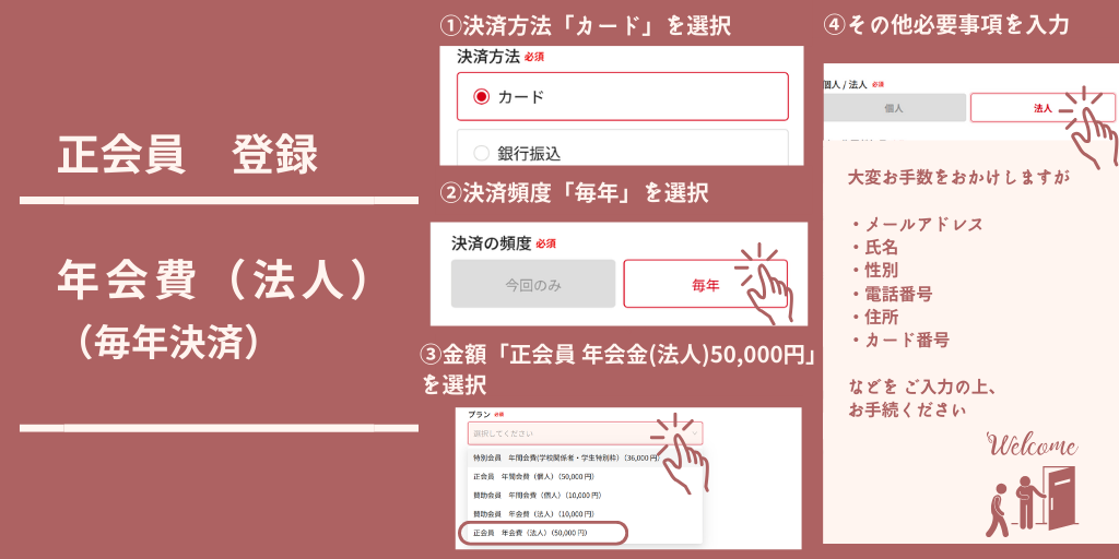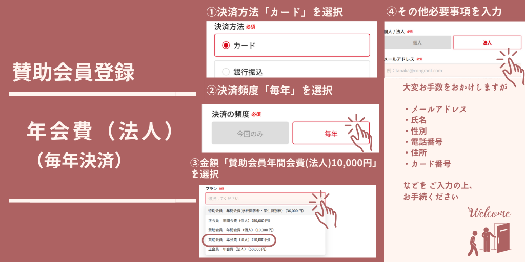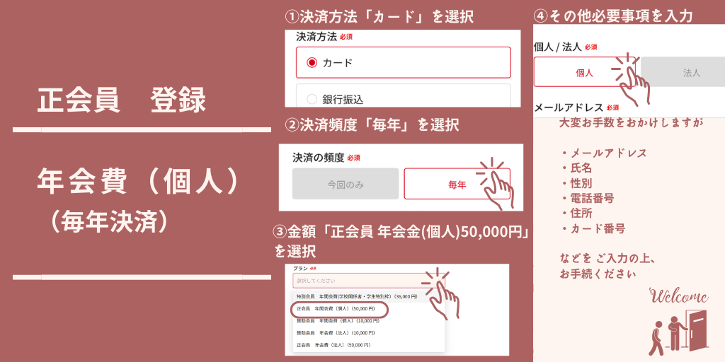 - カード決済の場合は、次年度以降の年会費のお支払いは今回決済が行われた日付に自動引き落としになります。