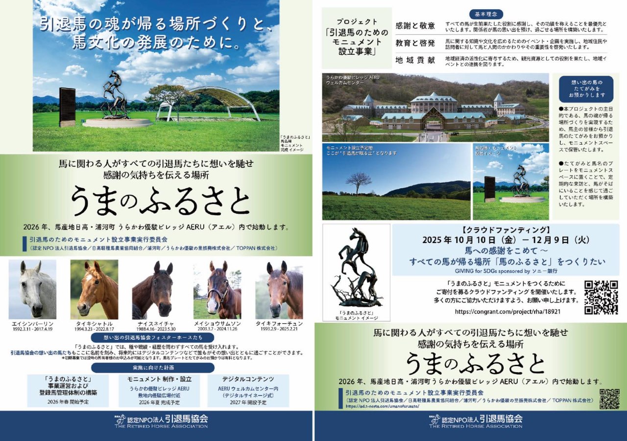 近年、引退馬についての関心が高まってきています。一方で、馬たちが余生を過ごす養老牧場などの数や設備はまだまだ充分とはいえません。さらに、馬が亡くなった後のケア、馬のオーナーや関係者が馬たちへ想いを寄せる場所は少なく、その整備が求められています。 引退馬協会では、長年、亡くなった馬たちを想い、馬たちが帰る場所づくりの構想を温めてまいりました。その構想を実現するために、このたび引退馬協会と日高軽種馬農業協同組合、浦河町ほかの協働事業として「引退馬のためのモニュメント設立事業実行委員会」を発足させました。 馬たちが帰る「うまのふるさと」をつくるには周辺整備を含めると多額の資金が必要となります。引退馬協会としてできることは、引退馬の最前線に立つ者として、ひとりひとりの想いを結集し賛同者を増やすことだと考え、象徴となるモニュメント本体に充てるために本クラウドファンディングを立ち上げました。 「うまのふるさと」の象徴となるモニュメントは、馬産地・日高にある、北海道浦河町の「うらかわ優駿ビレッジAERU」内に設立します。このモニュメントの対象となるのは、種を問わず、元競走馬だけでなく、乗馬などあらゆる生活をおくった引退馬です。この地を馬に関わる皆様の心の拠りどころとして大切にしていきたいと考えております。温かなご支援をどうぞよろしくお願い申し上げます。
