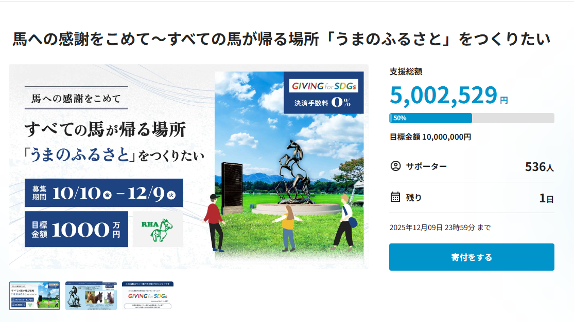 馬たちが帰る「うまのふるさと」をつくるには周辺整備を含めると多額の資金が必要となります。引退馬協会としてできることは、引退馬の最前線に立つ者として、ひとりひとりの想いを結集し賛同者を増やすことだと考え、象徴となるモニュメント本体に充てるために本クラウドファンディングを立ち上げました。