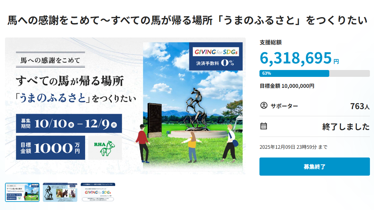 目標金額には届きませんでしたが、これほど多くの方が「馬たちの帰る場所~うまのふる さと」づくりの実現に向けて共に歩んでくださったことに、目標達成以上の大きな励ましをいただきました。