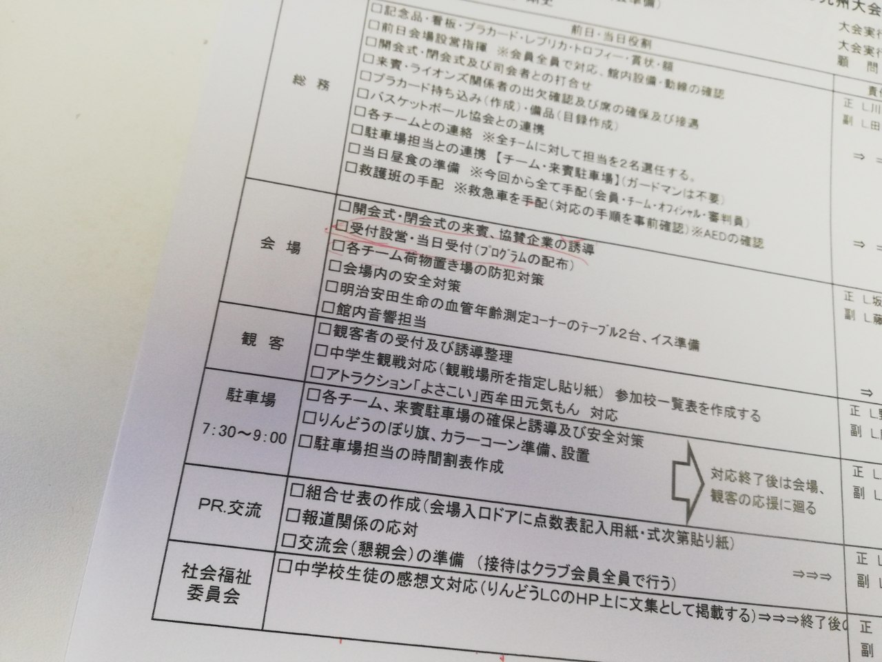 ほぼ全員出席の数十名で、前日当日の役割を確認しながら、開会・閉会式進行、プラカード、駐車場誘導担当、当日昼食の手配、救護班、プログラムの配布、来賓受付、館内音響、などなど細かく打ち合わせを行いました。