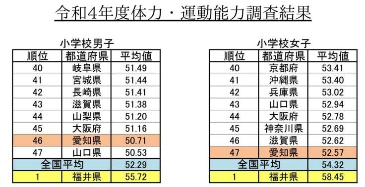 さらに、同調査における愛知県の順位です。令和4年度の「全国体力・運動能力、運動習慣等調査」によると、都道府県別で見たときに、愛知県の小学校の体力テストの平均が、男子は46位(ワースト2位)、女子は47位(ワースト1位)であることが判明しました。