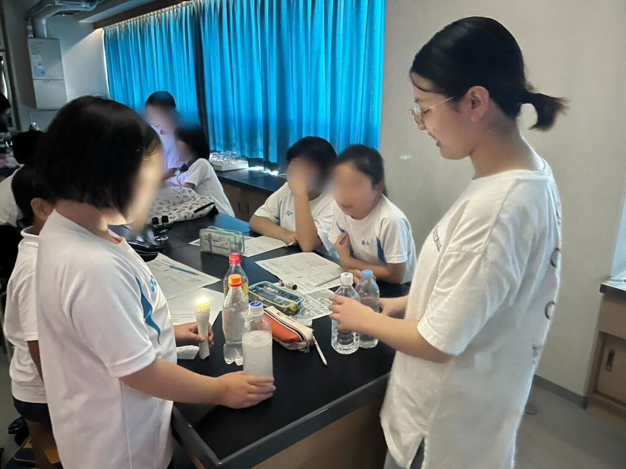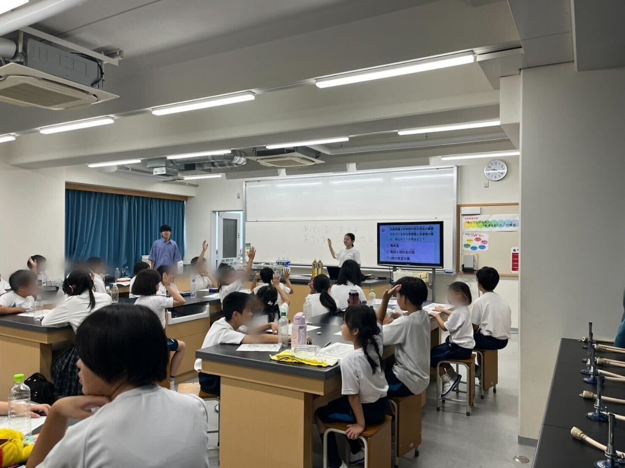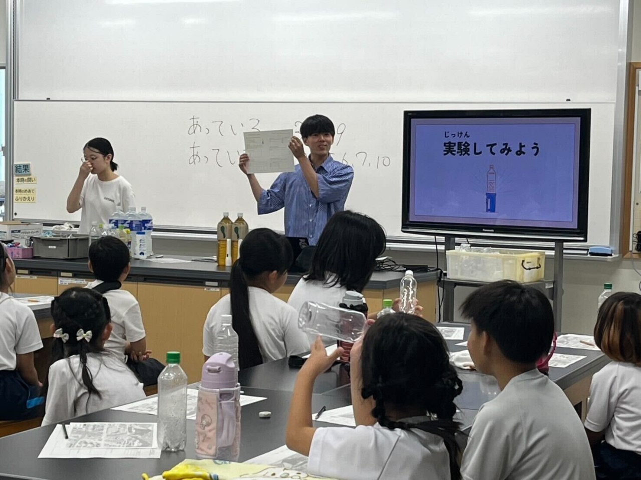 7月は京都市内の小中学校のサマースクールに招待いただき、出張授業を行いました。災害についてあまり触れたことがない小学生から、探究活動で災害について学んだ中学生まで幅広い生徒が楽しめるよう、ペットボトルランタンの実験やクイズを用いて行いました。感想アンケートでは、楽しかったとの声が多く、多くの人が防災に対して身近で楽しいというイメージを持つことができたのではないかと思います。