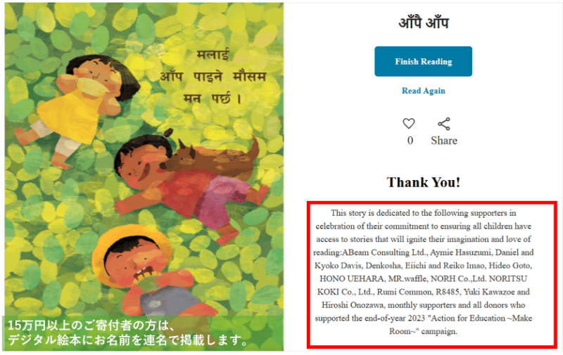 ・150万円:デジタル児童書に、ご希望のお名前を単独で記載いたします。