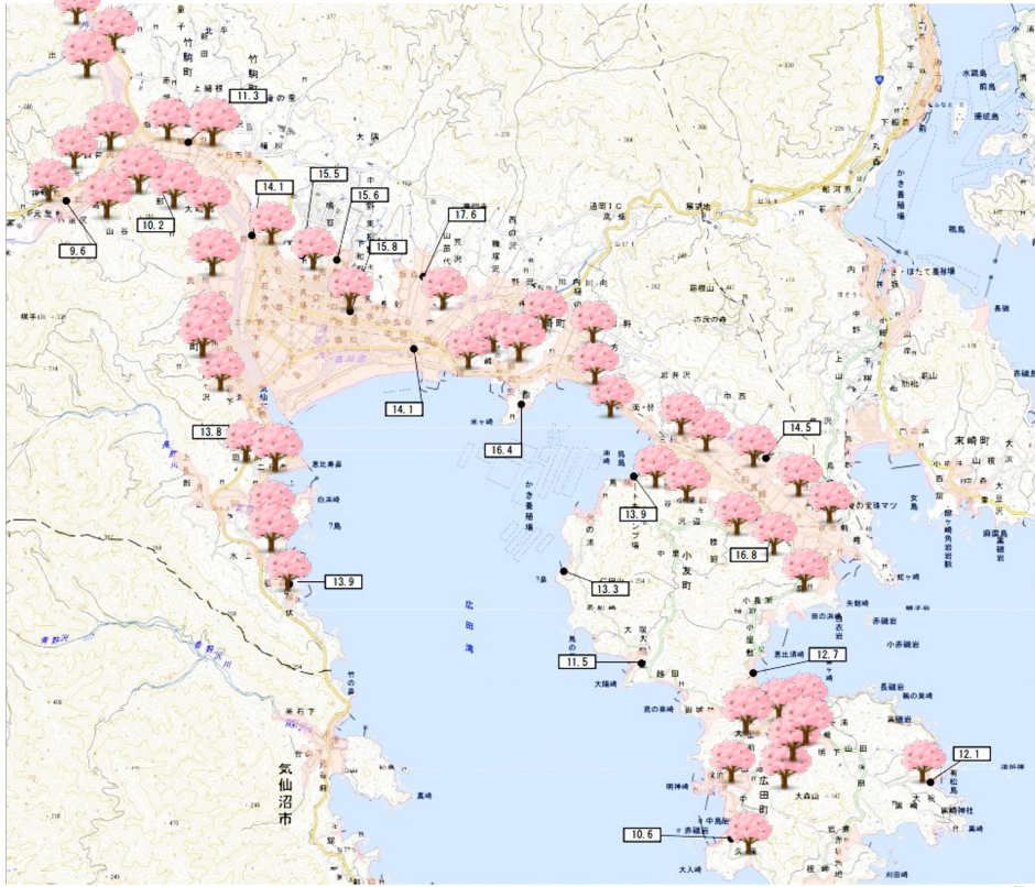 桜ライン311は、東日本大震災の津波最大到達地点を線でつなぎ、約170kmにわたって合計17,000本の桜並木をつくることを目指しています。