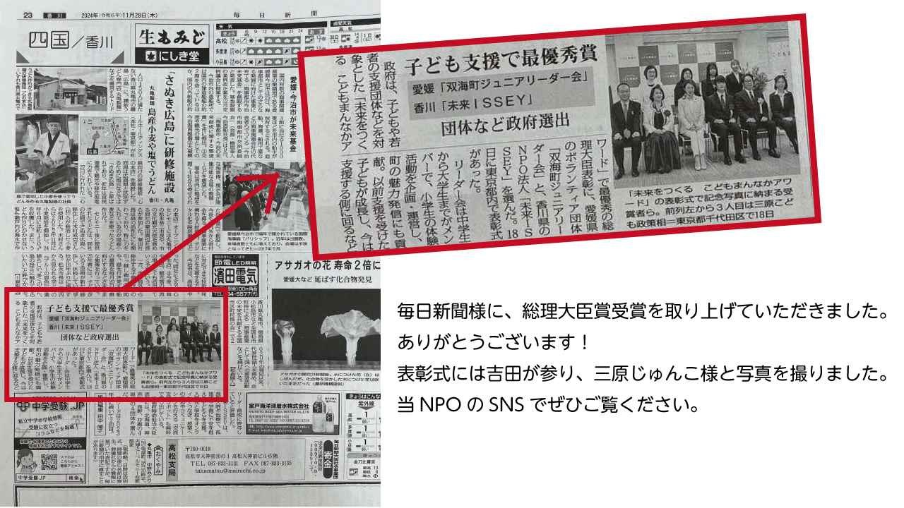 毎日新聞様にて、未来をつくるこどもまんなかアワードにて、最優秀賞を頂戴したことを取り上げていただきました。