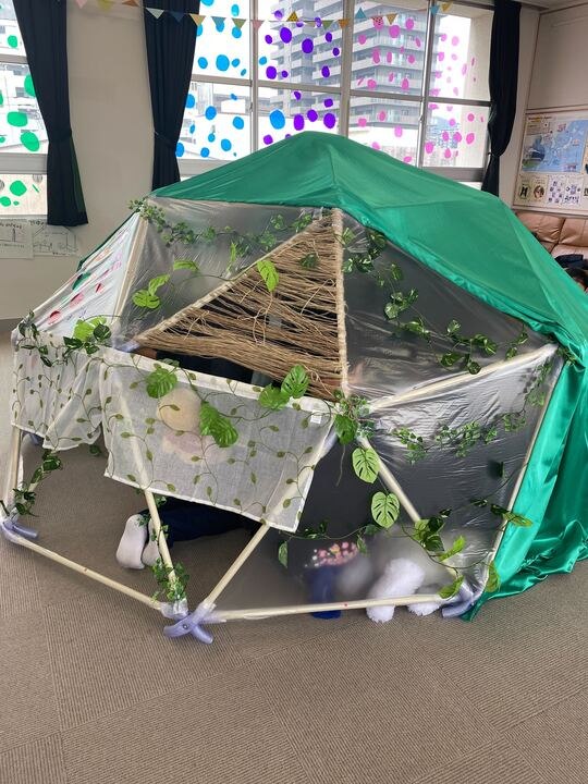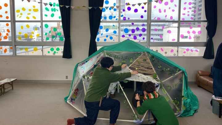 今まで虹の部屋の活動はスタッフで相談して決めており、子どもたちに活動のアイデアを聞くことがあまりなかった。今回来ていただいた講師は「学校」や「不登校の子ども」という枠にとらわれず、子どもたちの可能性を信じ、やりたいことを引き出してくれたように思う。普段の活動では個の活動や少人数での活動が多かったが、フラードームづくりでは協働の作業が多くあり、文化祭のような非日常感を子どもたちも楽しんでいた。