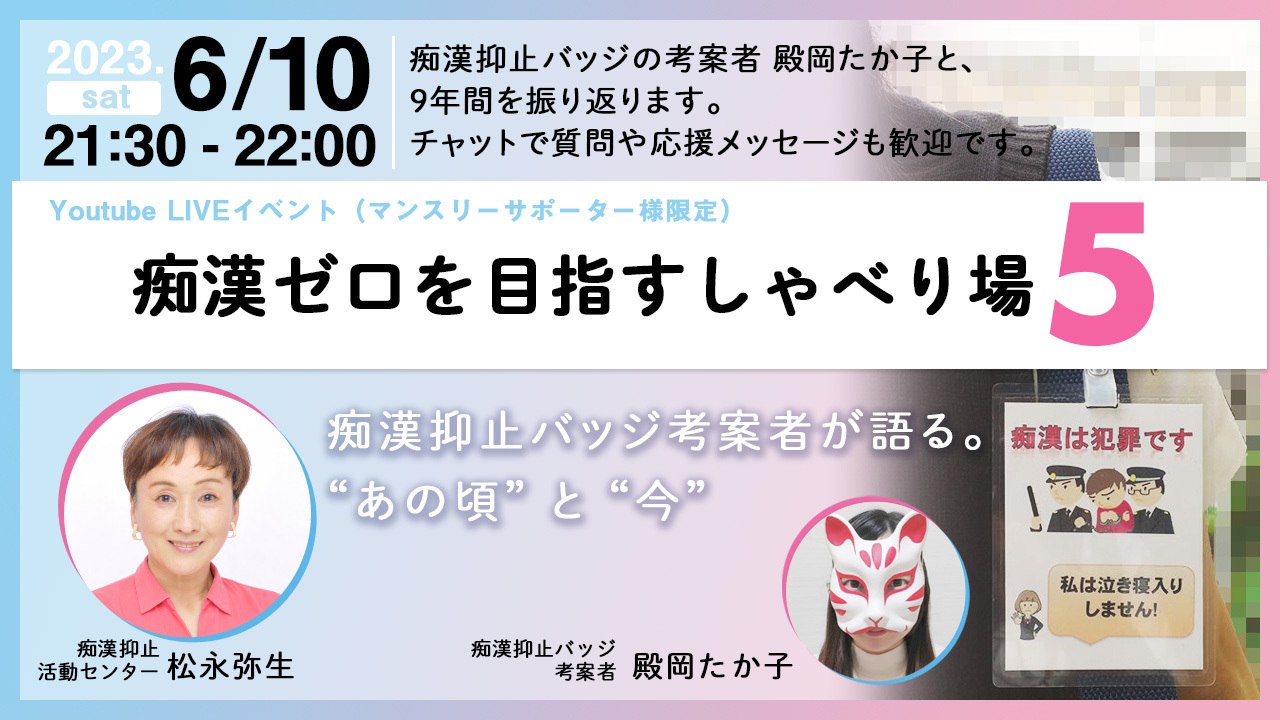 高校時代に痴漢抑止バッジを考案した殿岡たか子さんと、初めてのYoutube LIVEを行います。イベント参加者は、チャットでたか子さんに質問や応援メッセージを送れます。