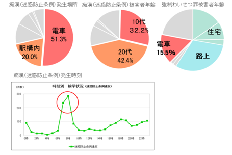 このグラフを見れば、痴漢犯罪が電車内と駅構内で多発しているのは一目瞭然です。同時に発生時間が朝の通勤ラッシュ時に集中しているのもわかります。驚くのは、悪質な強制わいせつ罪も、15%が電車内で起きていることです。
