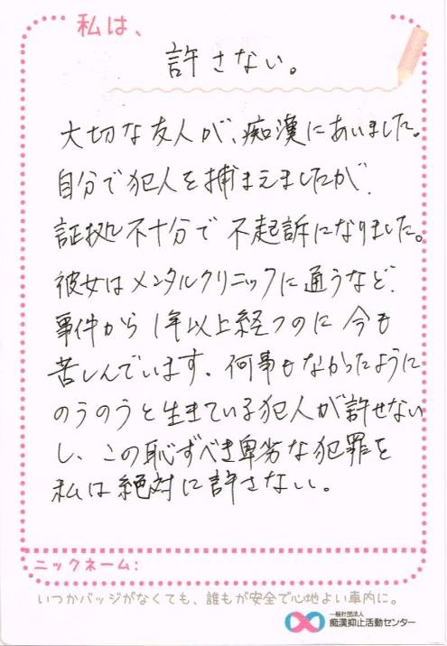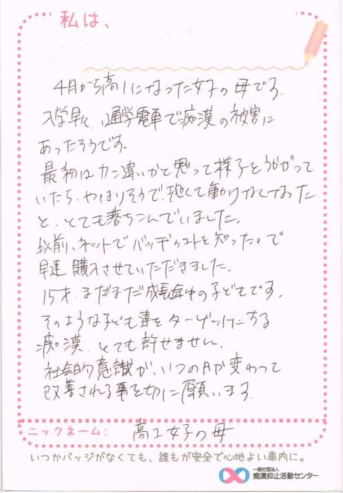 お問い合わせくださった方の娘さんは、痴漢抑止バッジをつけて安全に安心して通学ができているでしょうか……。