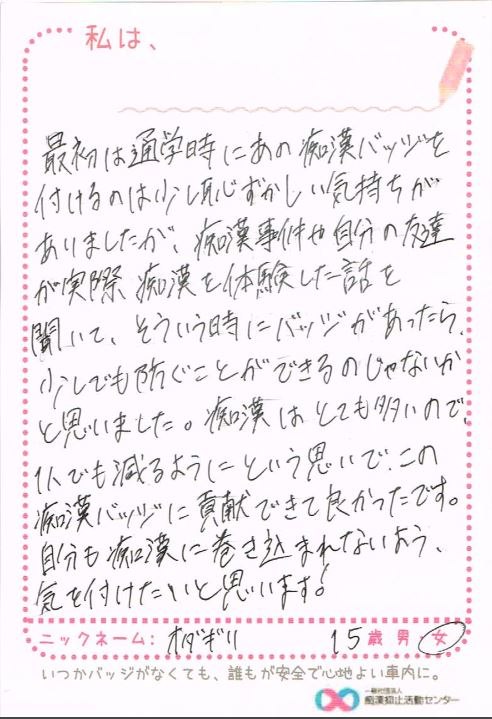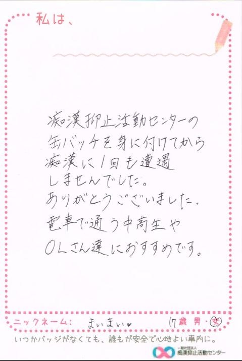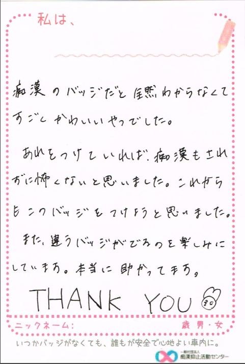 痴漢抑止バッジの購入者からハガキが届いています。掲載許可をいただいている声をご紹介します。