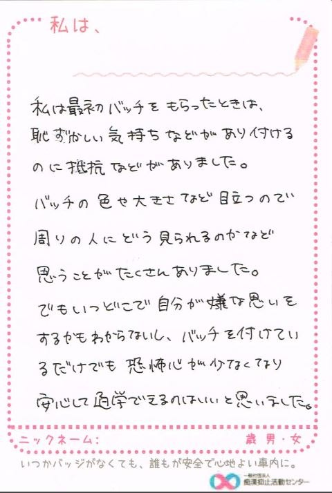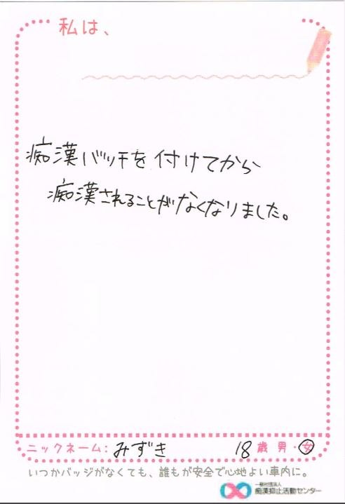 痴漢抑止バッジの購入者からハガキが届いています。掲載許可をいただいている声をご紹介します。