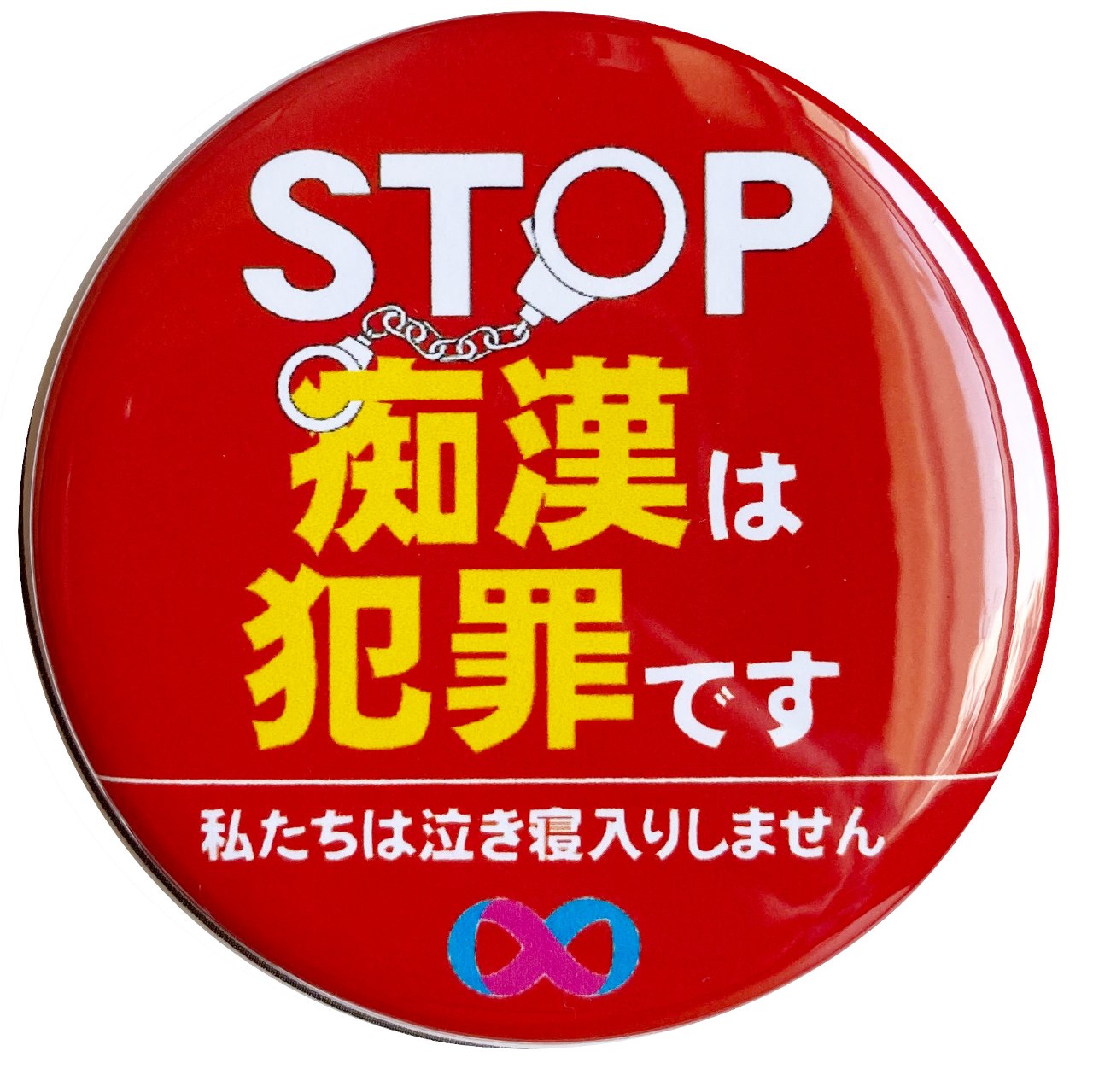 「STOP」の「O」を手錠に見立て、痴漢を逮捕しているようにデザインしました。 目を引くように赤や黄色などの「警告」を表す色を使っています。 痴漢加害者が、一瞬で痴漢抑止の意図が読み取れるよう、重要な文字(STOP・痴漢・犯罪)や手錠は大きく配置。 男性でも女性でもつけやすいシンプルなデザインにしました。