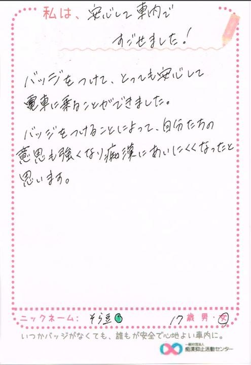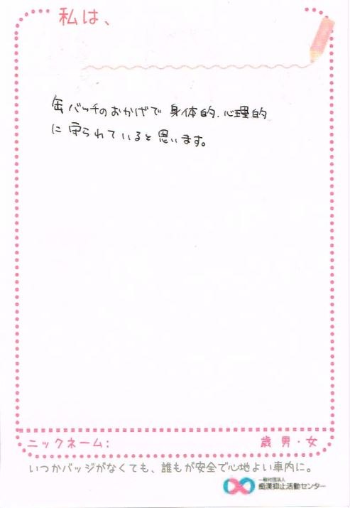 痴漢抑止バッジの購入者からハガキが届いています。掲載許可をいただいている声をご紹介します。