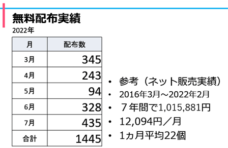 無料配布が可能になった背景には、2021年後半からマンスリーサポーターが増えたことがあります。おかげで月100個位なら無料配布できる体制が整いました。