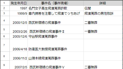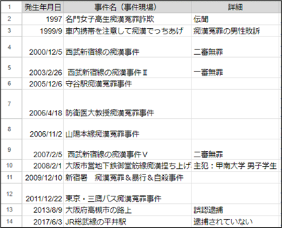 10月上旬、痴漢冤罪を心配する方々が「冤罪は山のようにある」と主張するので、これまでに起きた事件を上げてもらった。いただいた情報を一覧表にまとめたところ、1997年から26年間で13件の事件が確認できた。