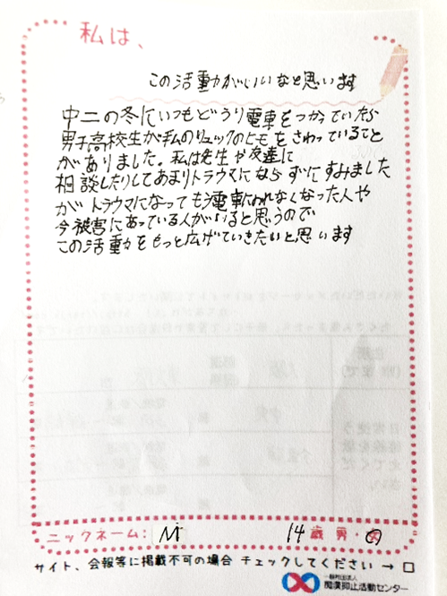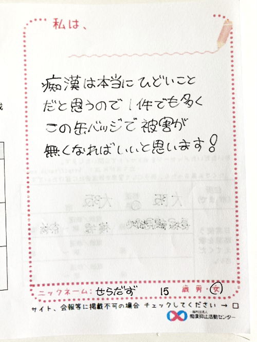 痴漢抑止バッジの購入者からハガキが届いています。掲載許可をいただいている声をご紹介します。