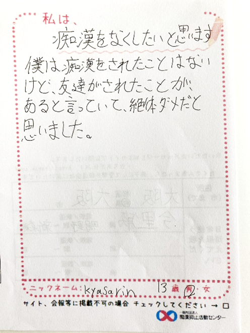痴漢抑止活動は、「痴漢が起こってから対応する」のではなく、「未然に防ぐ」という活動が良いと思いました。痴漢犯罪が起こりにくい環境を作っていくという事が大事だと感じます。