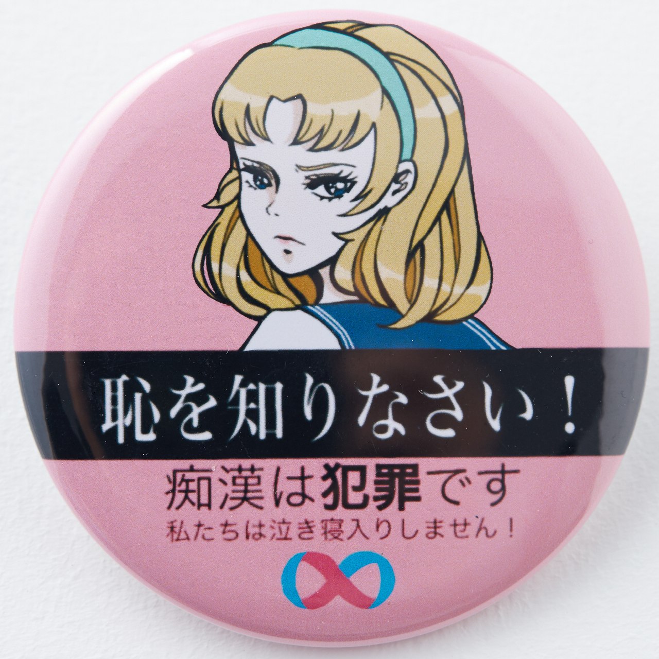 痴漢を未然に防ぐために、加害者がバッジを見た瞬間にドキリとするようなデザインにしました。