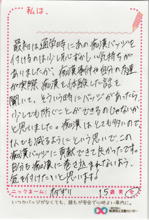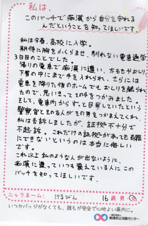 痴漢抑止バッジの購入者からハガキが届いています。掲載許可をいただいている声をご紹介します。