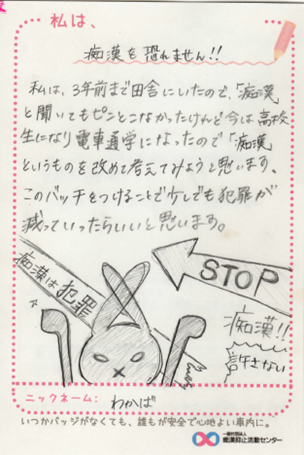 痴漢抑止活動へのメッセージ 痴漢は誰にとっても不愉快なものでもしかしたら誰かの人生を壊すものになるかもしれません。それを止めるための活動があることは誰かの助け、支えになるのでとても大切な活動だと思います。是非そのまま活動を続けて頂けると有難いです。