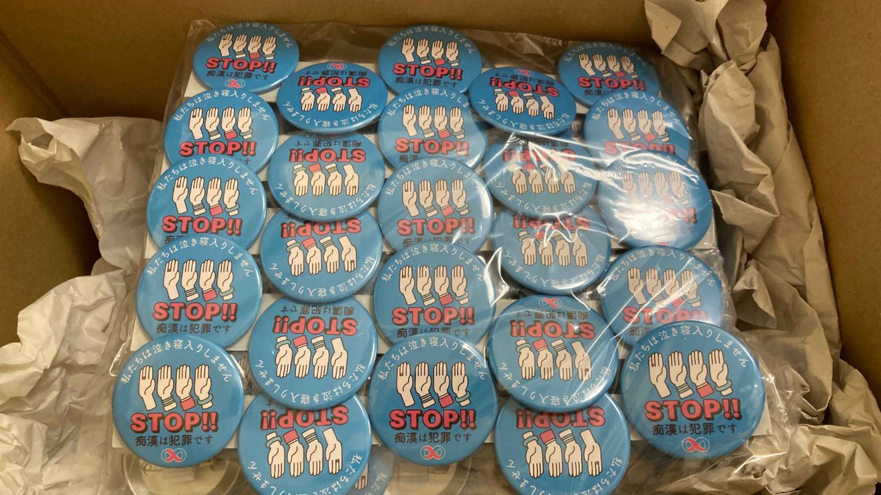 今回、新デザインの痴漢抑止バッジが納品されます。新着のバッジが400個超あります。事務所を移転したため、封筒に住所の訂正シールも貼らなければなりません。スタッフだけでは手が足りないので、ボランティアの方にも作業を手伝っていただきたく募集いたします。