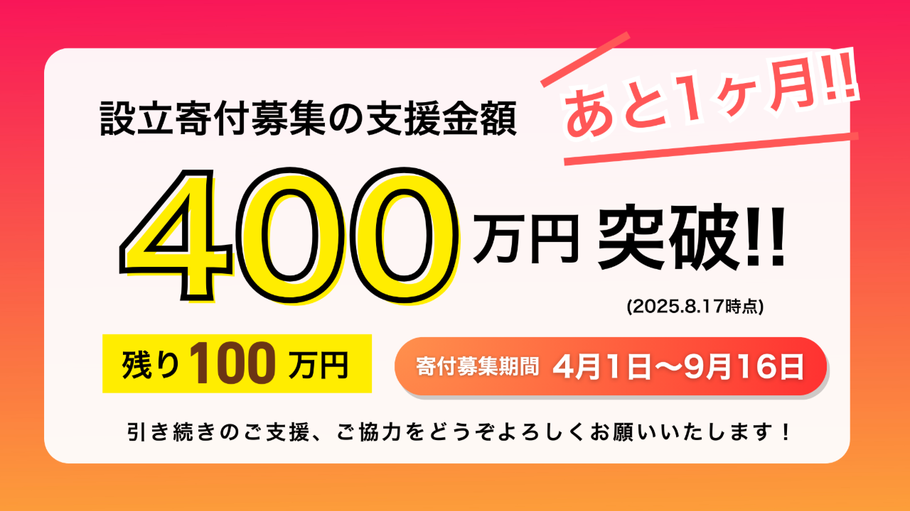 2025-09-17 09:40ネクストゴール700万円達成のご報告と今後について4月に寄付の募集を開始してから半年。当初の目標金額500万円を大きく超え、ネクストゴールの700万円も達成することができました。 皆さまからのご寄付に心より感謝申し上げます。2025-09-17 09:40ネクストゴール700万円達成のご報告と今後について4月に寄付の募集を開始してから半年。当初の目標金額500万円を大きく超え、ネクストゴールの700万円も達成することができました。 皆さまからのご寄付に心より感謝申し上げます。