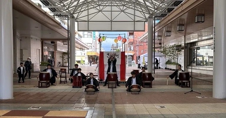 最初は湊零会の太鼓パフォーマンスから!実は、今年初めて鴨台盆踊りでは太鼓のパフォーマンスから始まりました。それがとても圧巻で酒田でも太鼓でスタートを切りたいと考えていました。実際に音が鳴り響く様子は圧巻でした。見る人を虜にして、イベントの知らせを運んでくれました。